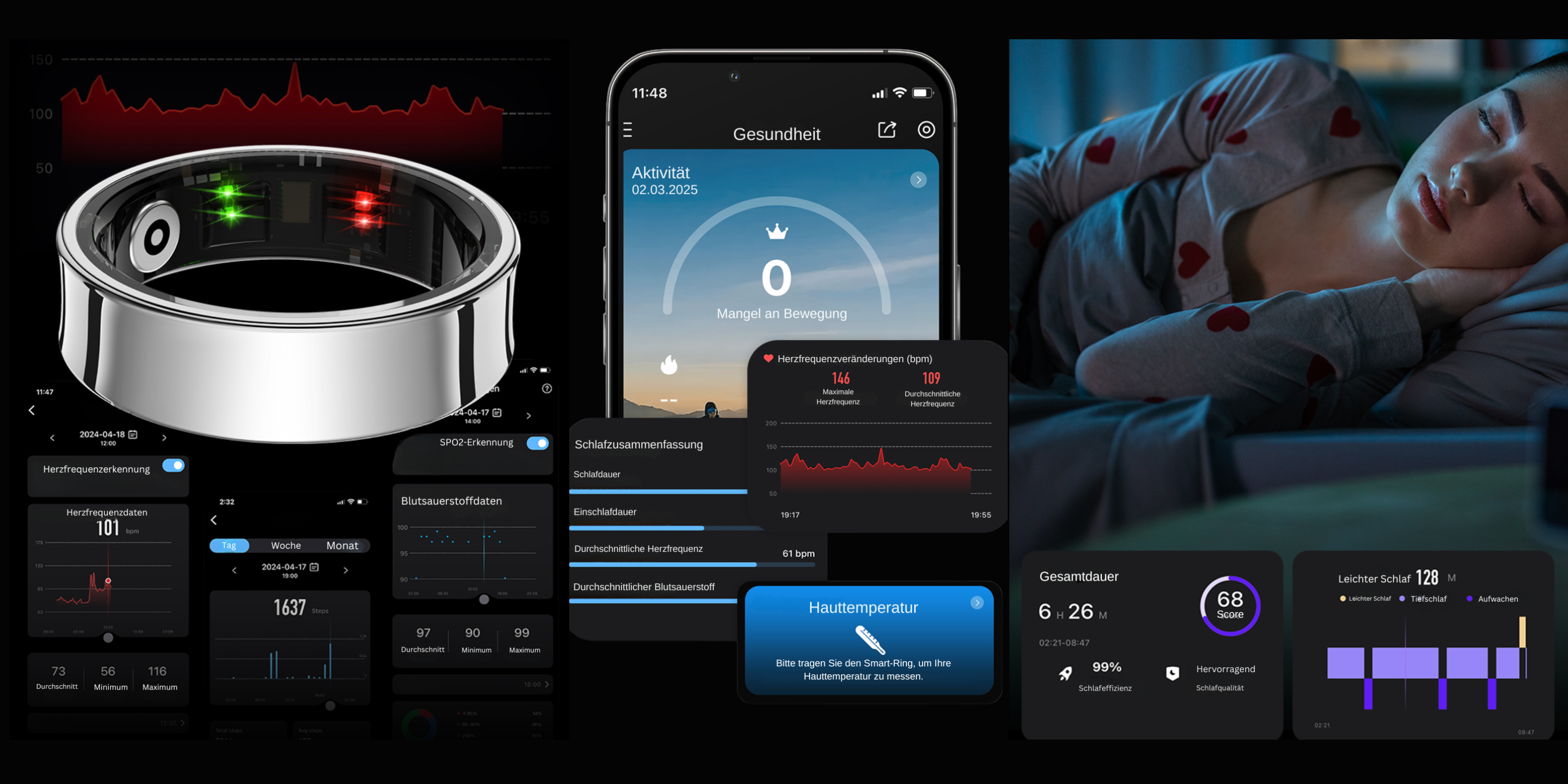 Der Fitvibez Smartring trackt deine Herzfrequenz, Schlafqualität, Sauerstoffsättigung, Schritte, Kalorien und bietet sogar Zyklus-Tracking für Frauen – alles in Echtzeit.